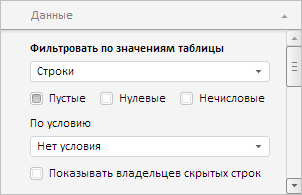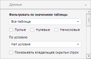 Для выполнения примера необходимо наличие на html-странице компонента ExpressBox с наименованием «expressBox» (см. «Пример создания компонента ExpressBox»). По умолчанию раздел «Фильтровать по значениям таблицы» на вкладке «Данные» боковой панели экспресс-отчета выглядит следующим образом: