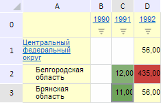 В результате выполнения примера было изменено форматирование таблицы экспресс-отчета с использованием раскраски ячеек путём масштабирования их значений с цветами от зелёного до красного: