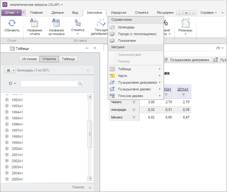 Для выполнения примера необходимо наличие на html-странице компонента ExpressBox с наименованием «expressBox» (см. «Пример создания компонента ExpressBox»). Для появления вкладки «Заголовок» необходимо нажать на кнопку «Заголовок» на вкладке «Главная». Отображаем меню кнопки «Отметка по измерению» вкладки ленты инструментов «Заголовок»: