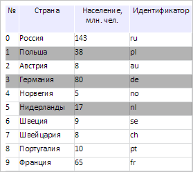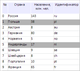 Для выполнения примера необходимо наличие на html-странице компонента DataGrid с наименованием «grid» (см. «Пример создания компонента DataGrid»). Зажмем клавишу CTRL и выделим в таблице строки с номером 1, 3 и 5: