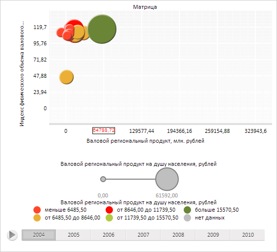 Для выполнения примера необходимо наличие на html-странице компонента с наименованием «bubbleChart» (см. «BubbleChart с наименованием «bubbleChart» (см. «Пример создания компонента BubbleChart»). Установим новое значение прозрачности фона области матрицы, установим левый отступ и нижнее поле области матрицы, установим заголовок области матрицы. Установим новый шрифт и границу текстовой метки оси X области матрицы, перерисуем текстовую метку, выведем общие значения ширины и высоты метки: