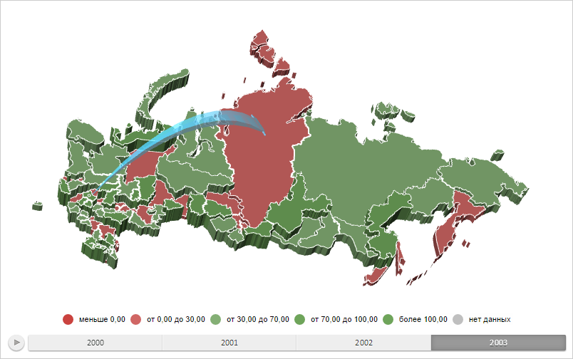 В результате выполнения примера была отображена трёхмерная стрелка, направленная от области слоя карты с идентификатором «RU-MOW» к области слоя карты с идентификатором «RU-KYA», со степенью детализации 0,095: