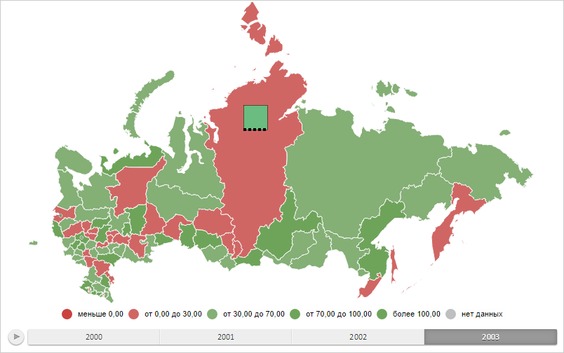 В результате выполнения примера был отображён столбиковый показатель для области слоя карты с идентификатором «RU-KYA», содержащий ось и отображающий данные только за первый период времени: