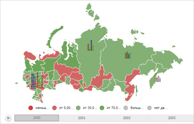 Для выполнения примера необходимо наличие на html-странице компонента MapChart с наименованием «map» (см. «Пример создания компонента MapChart»). Отобразим на карте все доступные столбиковые показатели и установим для них прозрачность, равную 50%: