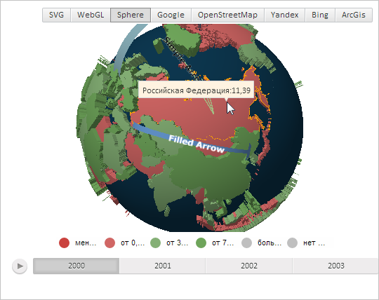 Наведём указатель мыши на область слоя карты, соответствующую России. По умолчанию треугольный элемент всплывающей подсказки будет отображён ближе к её правой стороне в точке наведения указателем: