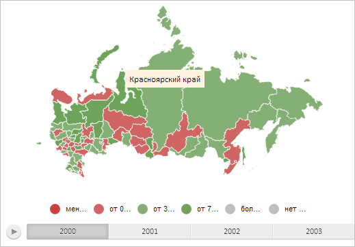Для выполнения примера необходимо наличие на html-странице компонента MapChart с наименованием «map» (см. «Пример создания компонента MapChart»). Нарисуем метку для области слоя карты с идентификатором «RU-KYA». Затем уменьшим масштаб карты, обновив расположение созданной метки: