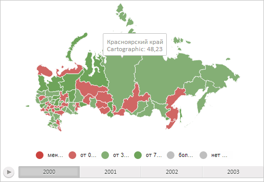 Для выполнения примера необходимо наличие на html-странице компонента MapChart с наименованием «map» (см. «Пример создания компонента MapChart»). Нарисуем для области слоя карты с идентификатором «RU-KYA» всплывающую подсказку. Затем уменьшим масштаб карты, обновив расположение созданной подсказки: