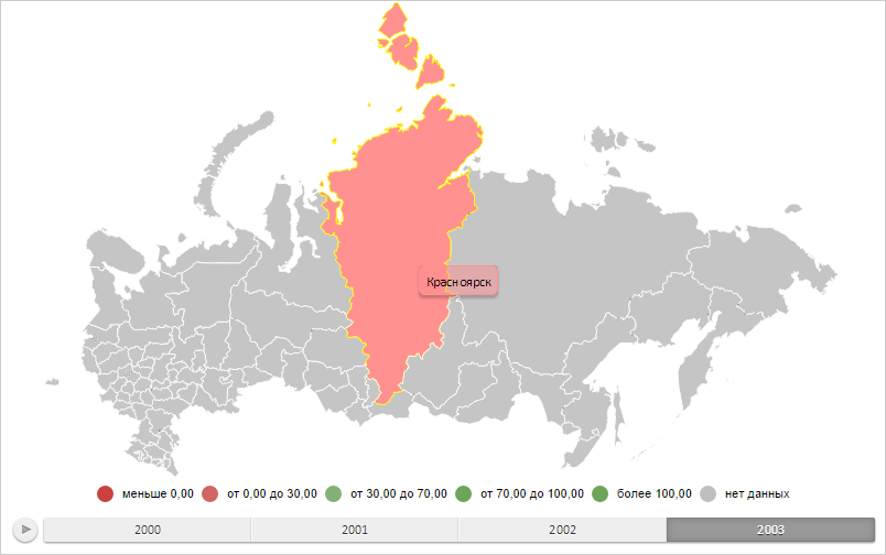 Для выполнения примера необходимо наличие на html-странице компонента MapChart с наименованием «map» (см. «Пример создания компонента MapChart»). Применим новые настройки для области слоя карты с идентификатором «RU-KYA» и отобразим всплывающую подсказку для неё: