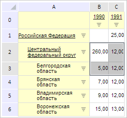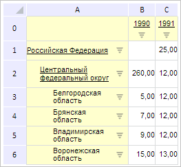 Для выполнения примера необходимо наличие на html-странице компонента ExpressBox с наименованием «expressBox» (см. «Пример создания компонента ExpressBox») и с загруженной таблицей в рабочей области экспресс-отчета. До выполнения примера таблица экспресс-отчета выглядит так, как показано на странице описания класса GridView.