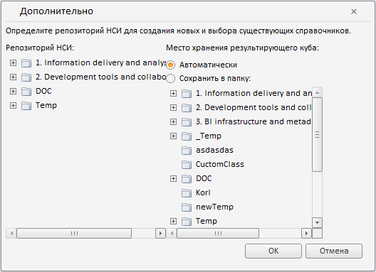 Класс RepositoryDialog реализует диалог для выбора репозитория НСИ и места хранения результирующего куба, который открывается при нажатии на кнопку «Дополнительно» на третьей странице мастера импорта данных.
