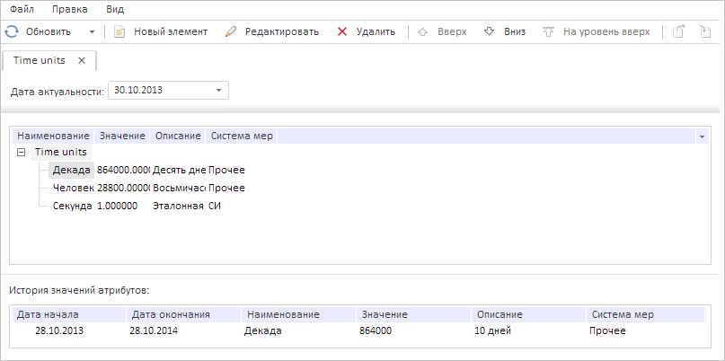 В результате выполнения примера в дереве элементов активного справочника НСИ был выделен элемент «Декада», а в дереве с историей значений атрибутов стали отображаться собственные данные: