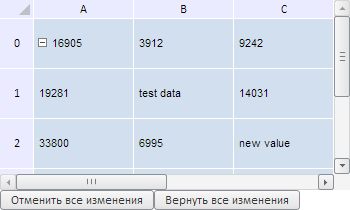 Для выполнения примера необходимо наличие на html-странице компонента TabSheet с наименованием «tabSheet» (см. «Пример создания компонента TabSheet»). Изменим значения двух  ячеек, а затем выведем тип выполненной команды, старое и новое их значения. Также добавим две кнопки - для отмены всех изменений и для возврата изменений назад:
