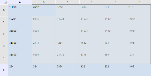 В результате выполнения примера диапазон, состоящий из одной ячейки C2, был расширен на две строки вниз, на четыре строки вверх, на один столбец влево и на три столбца вправо. Значение исходной ячейки было стёрто, ширина таблицы изменилась до 700 пикселей, а её высота - до 350 пикселей: