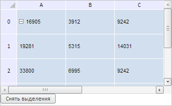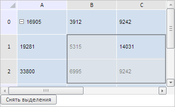 Для выполнения примера необходимо наличие на html-странице компонента TabSheet с наименованием «tabSheet» (см. «Пример создания компонента TabSheet»). Выделим диапазон ячеек B1-C2 и добавим кнопку для снятия выделенных областей в таблице: