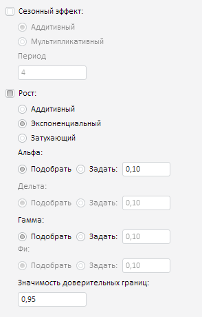 Мастер расположен на панели «Параметры» (на вкладке панели свойств «Ряд»). Мастер доступен, если в таблице выделен ряд, рассчитанный по методу «Экспоненциальное сглаживание».