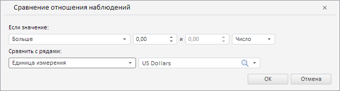 В результате выполнения примера в мастере для валидации данных путём сравнения отношения наблюдений был установлен атрибут «Единица измерения», для соответствующего раскрывающегося списка - серый цвет границы, а в раскрывающемся списке справа был загружен список единиц измерения с выбранным элементом «US Dollars»: