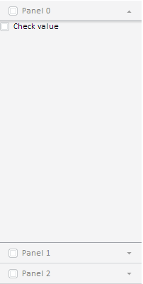 После выполнения примера на странице будет размещен мастер с тремя вкладками. Заголовки вкладок: «Panel + <индекс вкладки>». При загрузке страницы первая вкладка будет развернута. При разворачивании вкладки будет применяться анимация. На первой вкладке мастера добавлен флажок «Check value»: