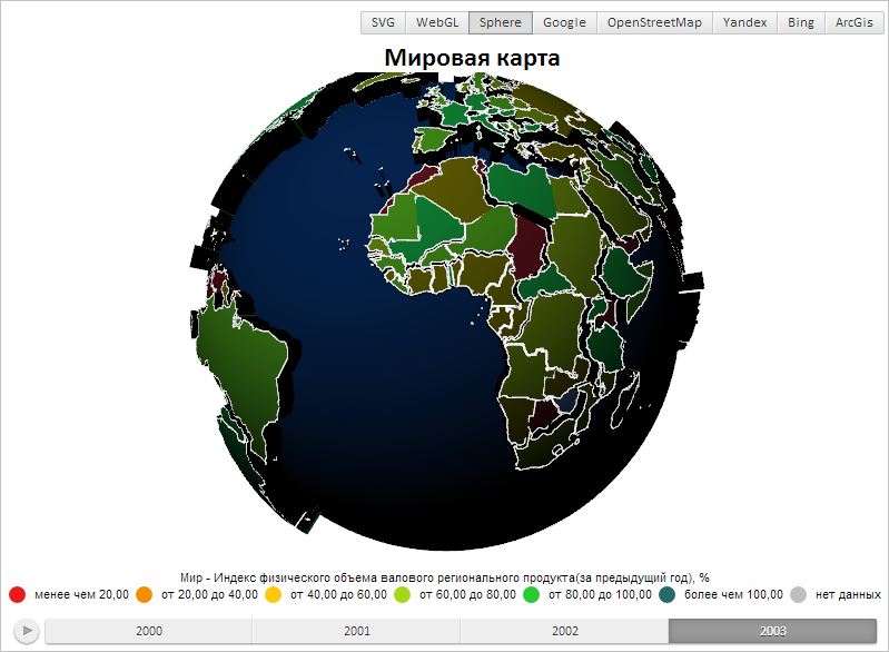 Для выполнения примера предполагается наличие на странице компонента MapChart c наименованием «map» (см. «Пример создания компонента MapChart»). Необходимо открыть сферическую карту. Изменим прямой и окружающий свет сферической карты: