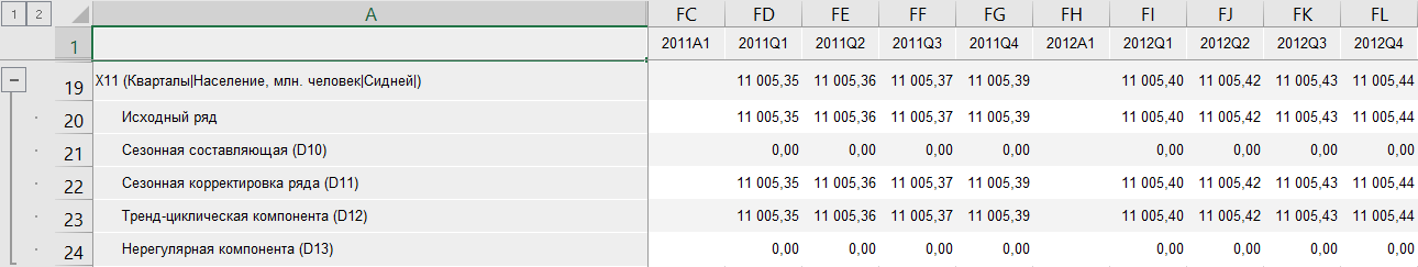 После применения метода в таблицу данных для каждого выделенного ряда будет добавлен ряд с наименованием вида «X11(<Имя_Ряда>)», содержащий результаты расчета. Например: