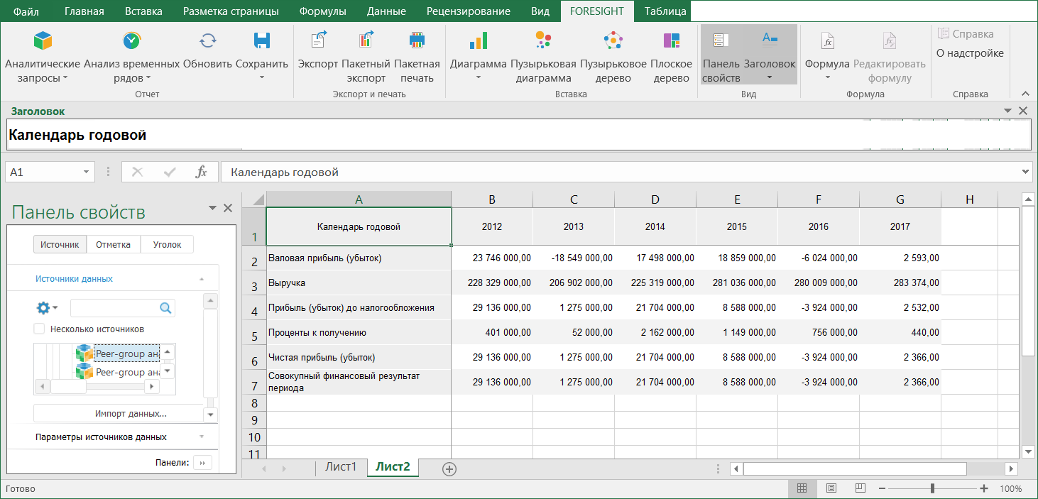 Надстройка Foresight Excel Add-In позволяет работать с «Форсайт. Аналитическая платформа» с использованием в качестве рабочего места Microsoft Excel. Предназначена для создания табличных отчётов с использованием инструментов «Аналитические запросы (OLAP)» и «Анализ временных рядов».