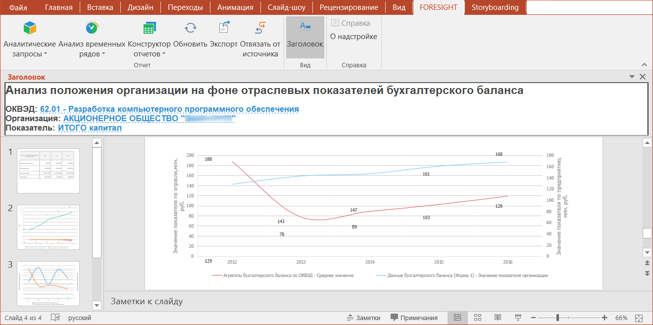 Надстройка Foresight PowerPoint Add-In позволяет работать с «Форсайт. Аналитическая платформа» с использованием в качестве рабочего места Microsoft PowerPoint. Предназначена для создания презентаций на основе отчётов с использованием инструментов «Аналитические запросы (OLAP)», «Анализ временных рядов», «Отчёты».