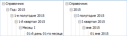 При выполнении примера в календарном справочнике будет задан различный формат представления наименований элементов на разных уровнях (изображение слева), который отличается от стандартного (изображение справа):