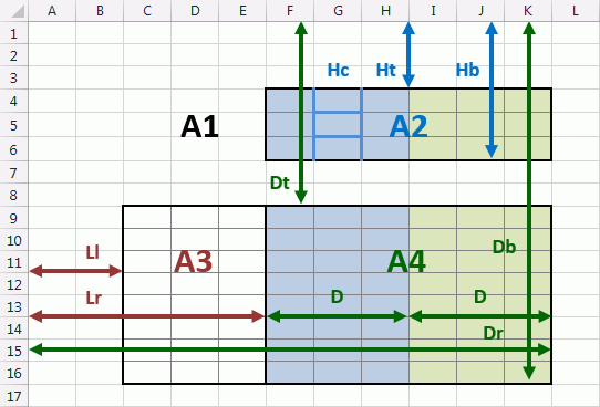 Стрелками на схеме показано какие размеры могут задаваться, цветом - для каких областей.