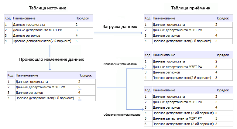 Свойству следует передавать строку, содержащую идентификаторы полей через точку с запятой. Данное свойство актуально, только если приёмник данных настроен на таблицу репозитория. Ниже рассмотрен пример использования идентификации записей. Источник и приёмник настроены на две одинаковые по структуре таблицы репозитория соответственно. Каждая таблица имеет три поля: «Код», «Наименование» и «Порядок». Для приёмника обновление записей установлено по полям «Код» и «Наименование». При таких настройках, если в таблице-источнике у существующей записи изменится значение поля «Порядок», при этом неизменными останутся значения в полях «Код» и «Наименование», то после загрузки данных в таблице приёмнике у соответствующей записи (значения «Код» и «Наименование» совпадают со значениями в источнике) изменится только значение «Порядок». Если же для приёмника не установить обновление записей по полям «Код» и «Наименование», то после загрузки данных в таблице приёмнике появится новая запись.