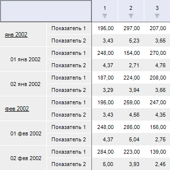 При нажатии на кнопку для экспресс-отчета, загруженного в «UiErAnalyzer1», будет включен подсчет итогов. По строкам будет рассчитываться сумма значений. Также будут рассчитываться промежуточные значений итогов. Будут созданы два вычисляемых показателя, осуществляющих расчет на базе значений первого столбца. Первый вычисляемый показатель будет рассчитывать процентное соотношение значений от общего итога, второй - процентное соотношение от промежуточных итогов. Для вычисляемых показателей будет настроен формат отображения.