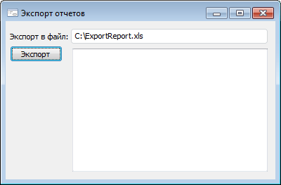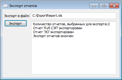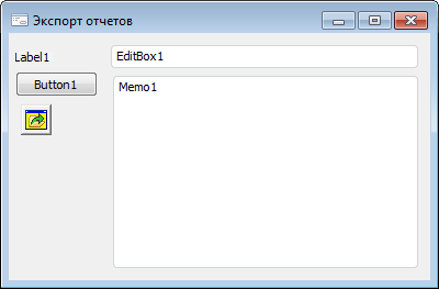 Форма должна работать следующим образом: пользователь нажимает кнопку «Экспорт», после это отображается диалог открытия объектов репозитория. В данном диалоге доступен выбор лишь экспресс-отчетов. Если пользователь выбрал один или несколько экспресс-отчетов, то они должны быть экспортированы в файл, указанный в компоненте EditBox, в формате XLS. По умолчанию в компоненте EditBox указан файл C:\ExportReport.xls. Сообщения о ходе экспорта должны выводиться в компонент Memo.