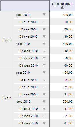 При нажатии на кнопку будет установлена сортировка по возрастанию значений первого столбца таблицы. Сортировка будет осуществляться по уровням иерархии в пределах одной группы.