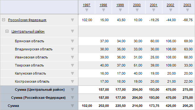 Результат: расположенный по строкам общий итог в виде суммы соответствующих измерений, находящихся выше вычисляемого элемента.
