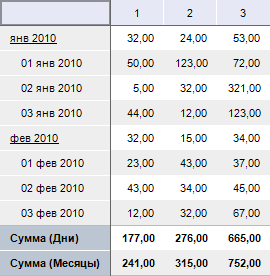 После выполнения примера для таблицы будут рассчитываться итоги (сумма значений): итоги по уровням включены, общий итог и итоги по иерархии выключены.