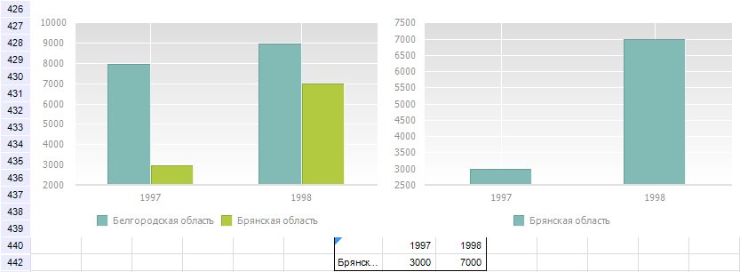 Ниже приведена область данных, часть строк которой скрыта. Пример диаграммы для представленной области данных, если значение IncludeHidden - True (слева) и IncludeHidden - False (справа):