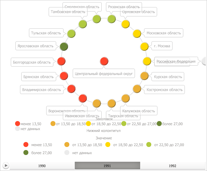 В результате выполнения примера была создана легенда с интервалами, не уменьшающая рабочую область пузырькового дерева. Для всех обязательных её свойств были указаны значения из соответствующих свойств цветовой легенды, а также был установлен заголовок и нижний колонтитул. Затем данная легенда была добавлена на диаграмму: