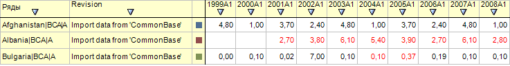 После выполнения примера в таблице данных будут отображены данные, соответствующие последней версии (ревизии) показателя. При наведении указателя мыши на ячейку с данными, будет отображена всплывающая подсказка с наименованием ревизии, в которой были произведены первые изменения показателя.