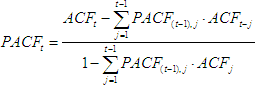 Частная автокореляция k-ого (PACFk) порядка от временного - это мера тесноты и направления линейной стохастической зависимости между текущими значениями временного ряда и значениями временного ряда на k моментов времени назад, при исключении влияния промежуточных значений Xt-1Xt-2, …, Xt-k+1.