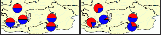 После выполнения примера на слой «Regions» будет добавлен круговой показатель, для штриховки которого будут использованы красный и синий цвета. Размер секторов показателя будет зависеть от данных.