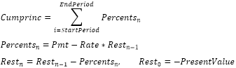 Метод Cumprinc возвращает кумулятивную сумму, выплачиваемую в погашение основной суммы займа в промежутке между двумя периодами.