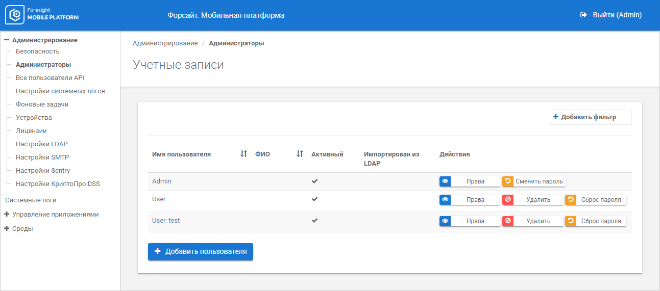 Для ведения учетных записей администраторов используйте подраздел «Администраторы».