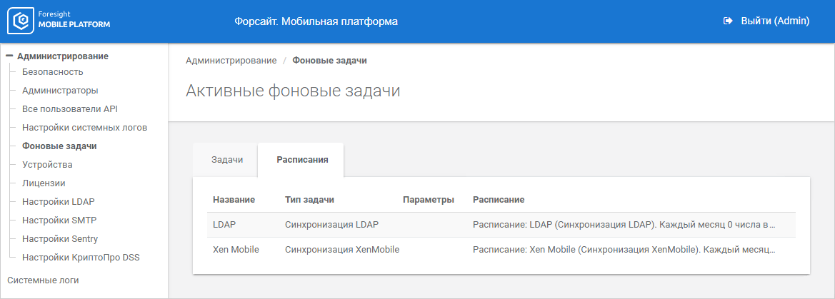 На вкладке «Задачи» отображается журнал с активными фоновыми задачами, которые выполняются в текущий момент по расписанию или происходят параллельно с платформой.