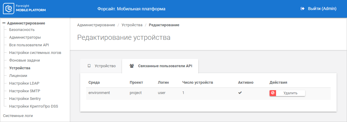 Список привязанных к данному устройству пользователей API отображается на вкладке «Связанные пользователи API» при редактировании устройства:
