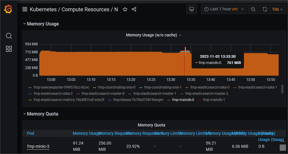 Определите значения «CPU Usage» и «Memory Usage» на диаграмме и сравните их с соответствующими значениями «CPU Limits» в блоке «СPU Quota» и «Memory Limits» в блоке «Memory Quota». Если значения «CPU Usage» и «Memory Usage» приближены к значениям «CPU Limits» и «Memory Limits», то контейнеры пода используют выделенные им ресурсы на максимум.