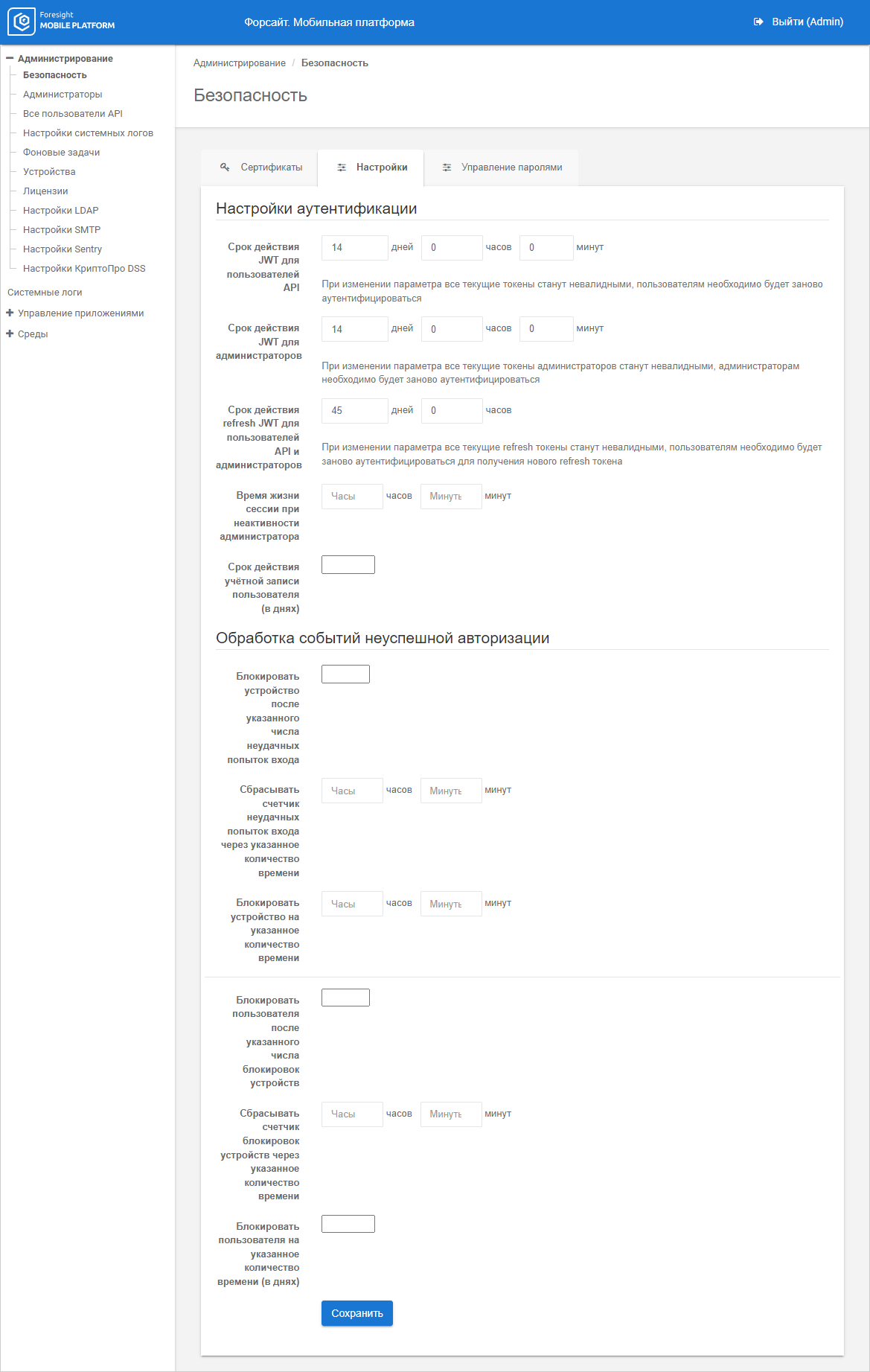 Примечание. Срок действия refresh JWT должен превышать срок действия JWT-токена для пользователей API и администраторов. При изменении срока действия JWT-токена или refresh JWT все текущие токены будут недействительны, субъектам необходимо заново выполнить аутентификацию.
