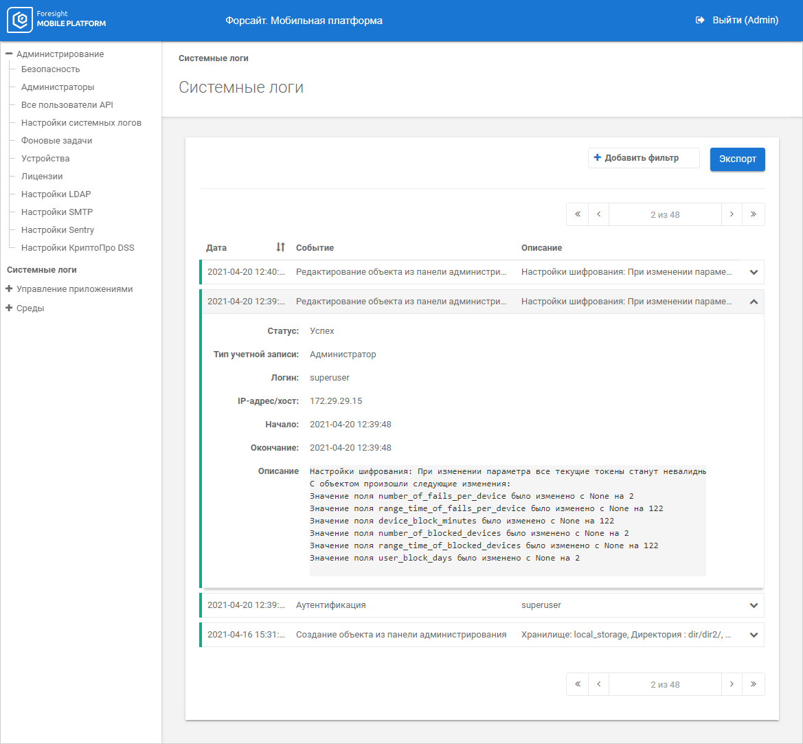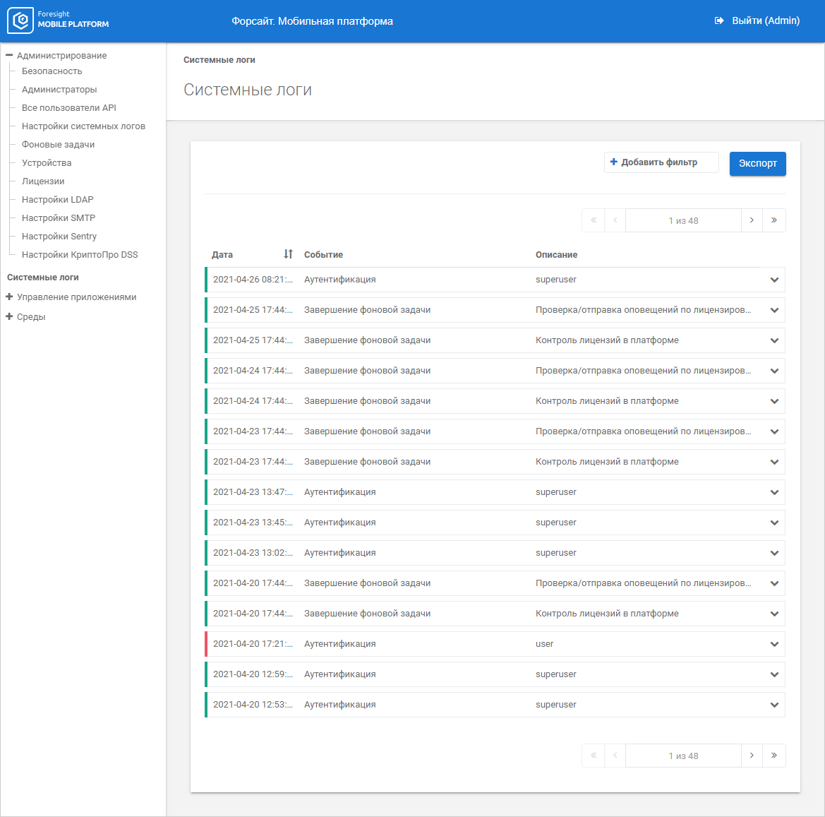 просмотр и настройка системных логов. Журнал с системными логами, идентифицирующий события, время и результат работы с сервером мобильной платформы;