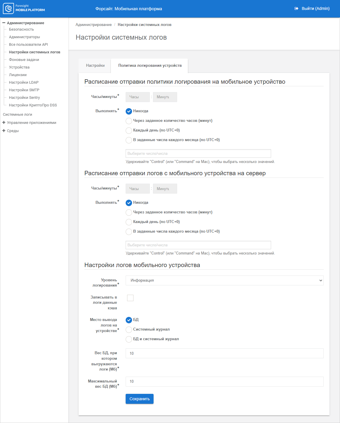 Для настройки параметров хранения логов на сервере мобильной платформы используйте вкладку «Настройки» в подразделе «Настройки системных логов»: