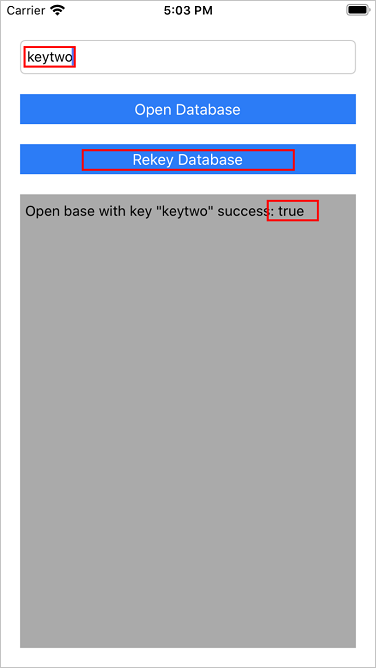 self.resultTextView.text = "Rekey base with new key \"\(newKey)\" success: \(self.rekeyDatabase(databaseName, newKey: newKey))"
