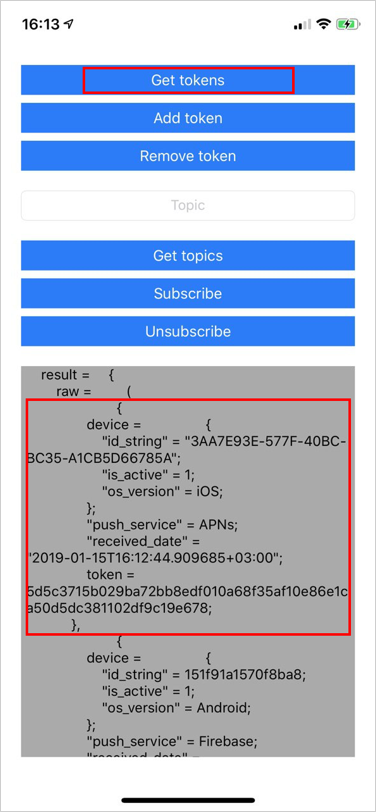 При нажатии на кнопку добавится заранее полученный токен устройства в список токенов на сервере мобильной платформы.