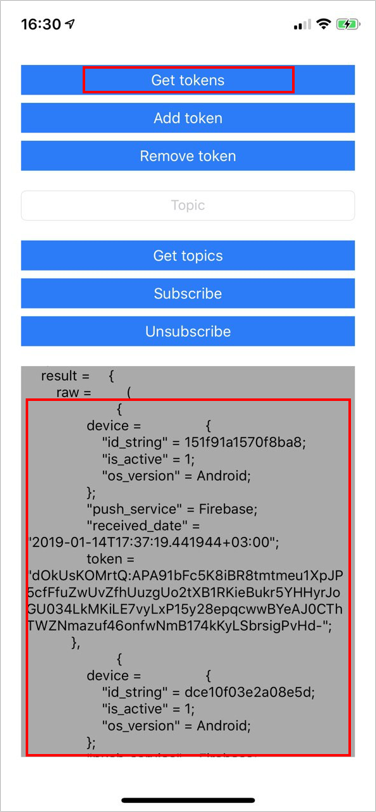 При нажатии на кнопку инициализируется запрос списка токенов всех устройств, которые были добавлены для получения push-уведомлений. Список устройств iOS пуст.