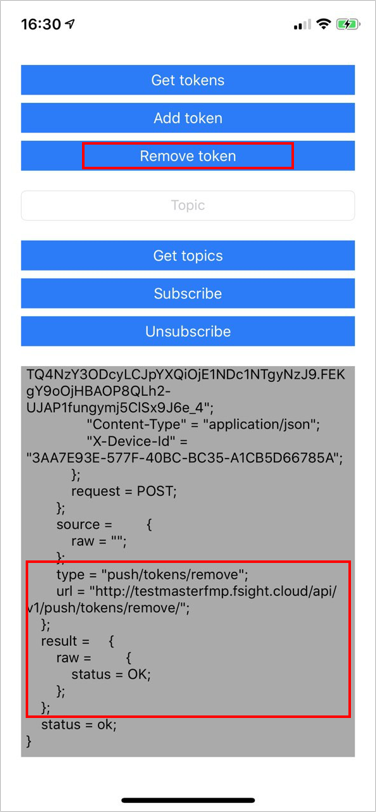 При нажатии на кнопку пользователь будет отписан от получения сообщений темы «topic2». Сервер мобильной платформы вернет ответ с указанием статуса операции.